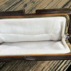 Lucite clasp. Inside pocket. Made in Hong Kong.