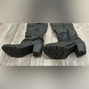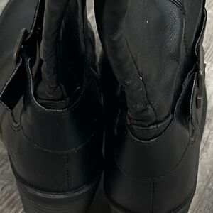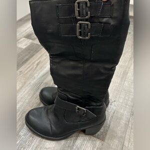 BOC boots- black. Inside leg zip. Double adjustable buckle at the top and one at the bottom. They have stretch panels. There are a couple areas of wear, but otherwise good condition. Man made materials. Size 8.