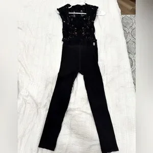 Step out in style with this elegant black lace jumpsuit. Perfect for any occasion, can be worn for a workout or a night out, this piece combines sophistication with comfort. Lace bodice is lined. Worn only once.