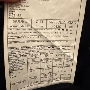 Jacket: 50R US (Slim fit Havana cut – flattering, not overly skinny).