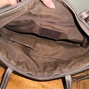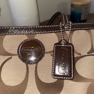 Stylish Coach tote with signature pattern. Features tan and brown hues. Perfect for daily use.