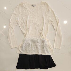 Liz Claiborne Petite Long Sleeve Creamy White Cotton Blend Sweater. V-neck subtle AOP diamond design and delicate silver sequin bling details