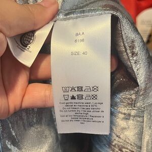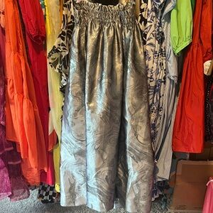 Chic dress with silver and patterns. Ideal for elegant events. Easy to wear, pull on style with straps and pockets and elasticized top. Size 40/8 but I wear a L/Xl and this still fits me. Very forgiving. Purchased from Neiman Marcus - originally retails for over $200 so get this super fun and easy to wear dress (perfect for the holidays) now!