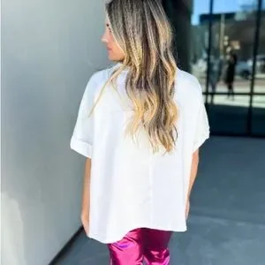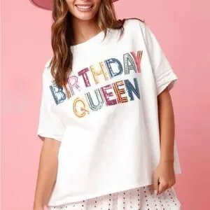 The Birthday Queen Sequin Oversized T-Shirt in size Large is a stylish and eye-catching addition to any wardrobe. Made from 100% cotton, this white t-shirt features a solid pattern with short sleeves and a racerback strap type. The rhinestone and sequin accents add a touch of glamour, perfect for a casual occasion or birthday celebration. With its oversized fit and cropped style, this t-shirt by Peach Love is ideal for the spring and summer seasons, adding a fun and trendy look to your outfit.