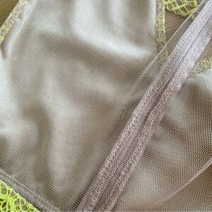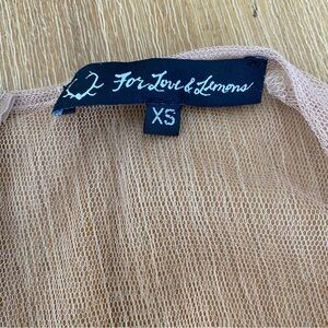 Exotic and sexy as hell, the For Love & Lemons Antigua Beige and Yellow Lace Mini Dress is a lacy looker for the daring dame! Bright chartreuse yellow lace is backed by beige tulle that breaks away into a sheer back, scalloped hemline, and long sleeves with lace cuffs. Plunging V-neckline points towards a fitted bodice with banded waist. Unfinished hem. Hidden back zipper. Chartreuse lace is lined, except at the cuffs. Model is 5'9" and is wearing a size X-small. Self: 100% Nylon. Lining: 87% Polyester, 13% Spandex. Contrast: 100% Polyester. Dry Clean Only.