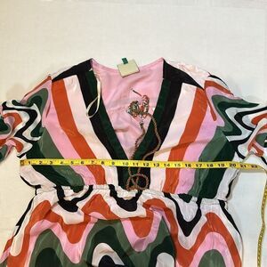 This stunning multicolor V-neck maxi dress features a vibrant wave pattern. Perfect for any occasion, it combines style and comfort effortlessly. See photos of measurements for accurate sizing. All measurements are approximate