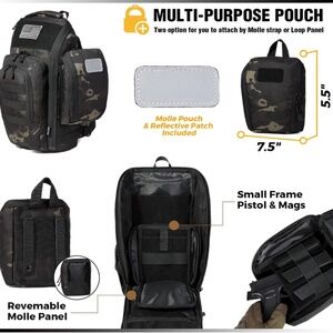 DBTAC Tactical Sling Bag for Everyday Carry features 4x Compartments (Clamshell opening main compart': L13”xW8“xD4“). Extra accessories: #1- 1x Embroidered USA flag patch (3.1”x2.2”), #2- 1x Pistol Pouch with 3x Mags slots and removable Molle panel (L8“xW6“xH2”), #3- 1x Universal Holster with Hook Strap that fits most popular pistol sizes.