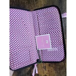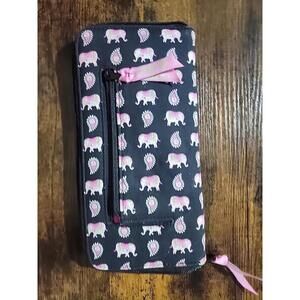 This is a little bit dusty from sitting in a closet.The Vera Bradley Pink Elephants Zip Around Wallet Clutch Wristlet Purse Tote is a stylish unisex accessory featuring a vibrant pink elephant design on a black background. This versatile wallet is perfect for on-the-go use, with a convenient zip around closure and wristlet strap for easy carrying. The Vera Bradley brand ensures high quality and a fashionable look, making this wallet a must-have for any trendy individual.