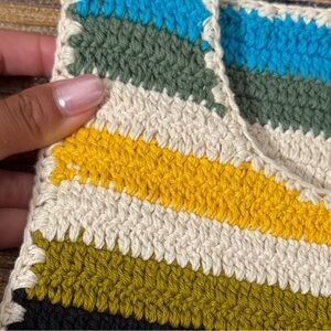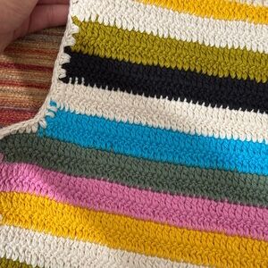 Vibrant crochet top with multicolor stripes. Features sleeveless design and side ties.