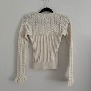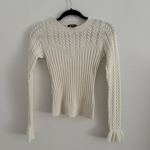 Chic cream turtleneck sweater with cable knit design. Soft and stylish for any occasion.