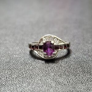 Gorgeous silver plated ring has a large purple stone surrounded by smaller clear rhinestones and there are four square purple stones on each side.