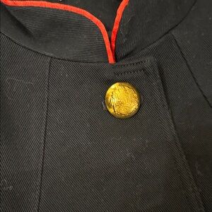 Elegant navy officers style jacket with gold buttons and red piping. Features distinctive sleeve details. Size 8.