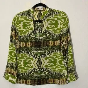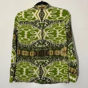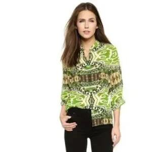 Alice + Olivia silk green patterned women's top, size small in good condition perfect for any occasion. Elevate your wardrobe with this unique design.