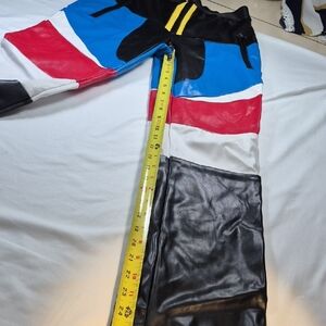 Vibrant women's leather looking pants featuring a bold mix of colors. Perfect for making a statement.