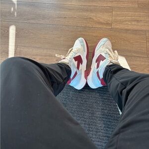 Stylish Off-White sneakers. Cream base with burgundy accents. Comfortable and trendy design.