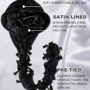 Satin Lined Halo Turban Durag The soft, comfortable Satin lining keeps you cool and dry all day. The outer is Modal fabric that is flexible and durable and looks good even years. The pre-tied cap tail with handmade braids twist tail is a standing-out feature. Offering various colors that are perfect for casual or formal looks, the 2024 upgraded halo satin lined turban for men is sure to become your favorite.
