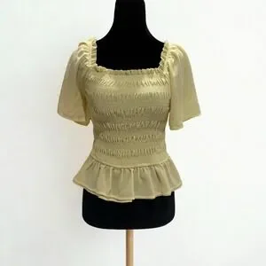 Heatherly Woman's Gale Yellow Smocked Cropped Blouse Short Sleeve Size Small