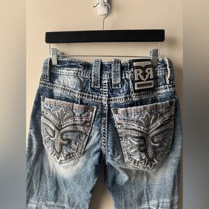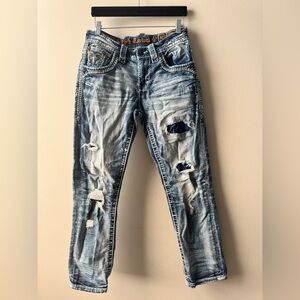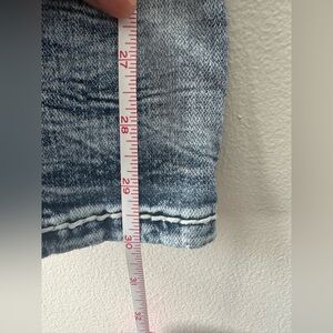 Features: Slim fit, comfort stretch fabric, straight from knee to hem, low rise, 15" bottom opening, embroidery on faux flap back pockets, hand sanding, whiskering, grinding, destruction with fill yarn, denim backing, and veining details.