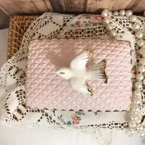Beautiful pink with gold trim and dove for handle. Quilted design, made in Japan. Cigarette, trinket box. Good condition, no chips or cracks. See measurements in photos. Nice for the bathroom or on a dresser.