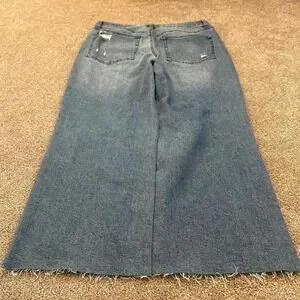 These Super Baggy Wideleg Jeans feature a massive 10-inch leg opening and are a Size 32 Waist. They offer a clean fit with great details, perfect for everyday wear and skate, embodying a distinct Y2K style. Measurements are available in the photos.