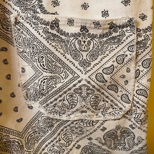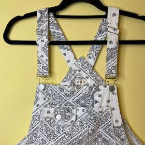 Stylish romper with intricate gray patterns. Comfortable fit. Perfect for casual outings. GUC, some wear on the fabric and fraying at the raw edges. Still lots of life in these overalls!