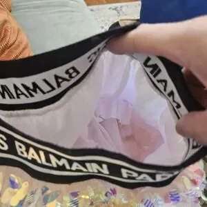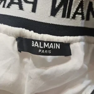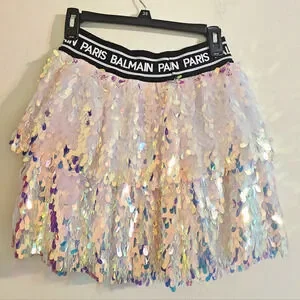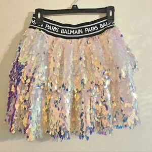 Stunning A-line skirt by Balmain. Features iridescent sequins. Elastic waistband with brand logo.
