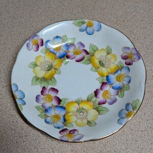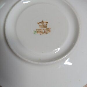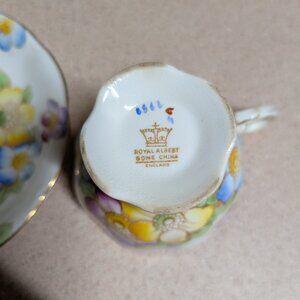 Royal Albert Bone China Teacup & Saucer Set. Multi-colored flowers with a delicate gold trim. Pre-owned, but in good condition. Sound staining is visible inside the saucer - please look closely at the photos. No cracks or chips observed.
