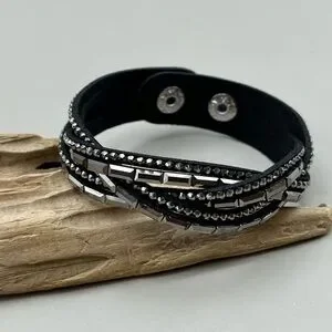 Elevate your style with this stunning black leather bracelet, adorned with a mesmerizing array of silver and black gemstones. The intricate design features multiple rows of braided beads and gemstones, carefully crafted to create a sophisticated and eye-catching accessory. Perfect for dressing up or adding a touch of elegance to your everyday look, this bracelet is sure to turn heads. Its unique blend of textures and colors makes it a standout piece that will complement any outfit. Item # 544