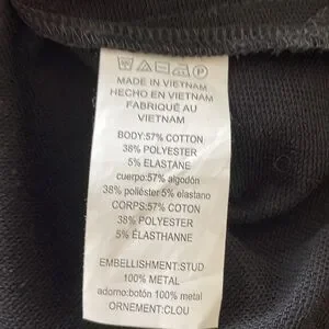 Fabric content is 57% cotton, 38% polyester, 5% Elastane. Studs are 100% metal.