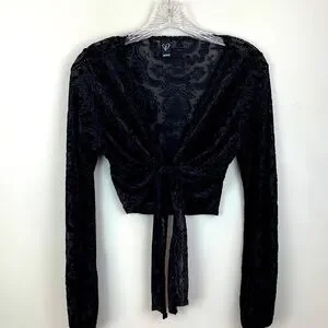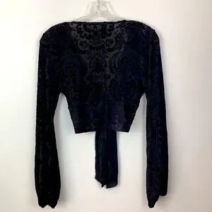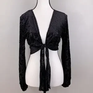 Chic black lace blouse with long sleeves. Features a tie-front detail.