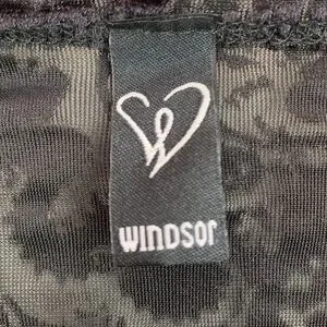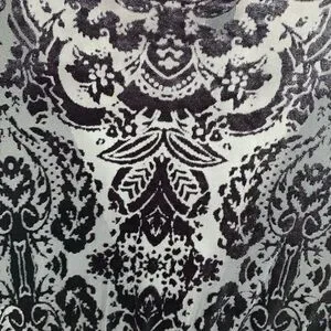 Sheer mesh fabric with a velvet burnout floral pattern.