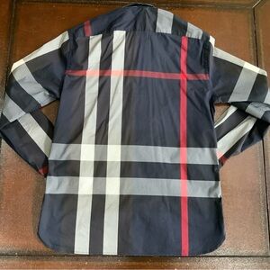 Elevate your style with the Burberry Men's Navy Plaid Shirt. Featuring a classic plaid design in navy and red this shirt offers a sophisticated look for any occasion. Perfect for both casual and formal settings.