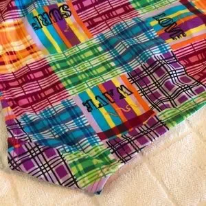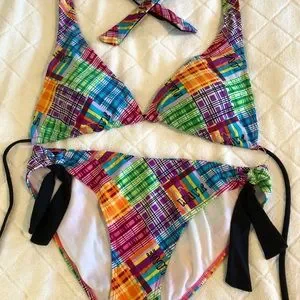 Op bikini with reversible top, size L. Top has light padding. Bottom and top have moderate coverage. No fading or flaws.