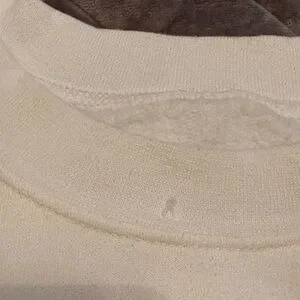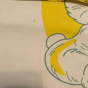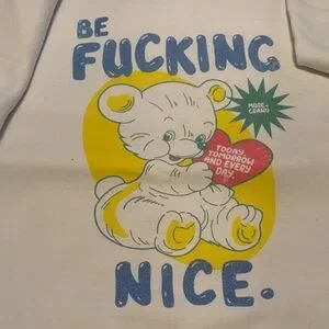 White sweatshirt featuring a playful bear graphic with blue and yellow accents. Bold text adds a fun touch.