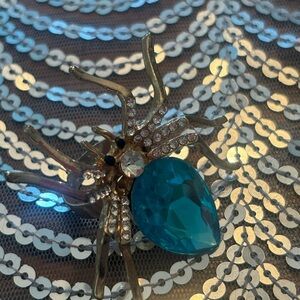 Unique gold spider ring featuring a striking blue gem and sparkling accents.