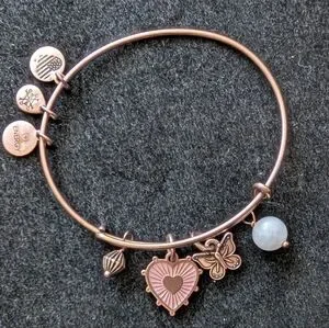 Elegant antique rose gold finish multi charm bangle featuring heart and butterfly designs. Perfect for adding a touch of sophistication to any outfit.