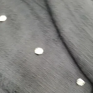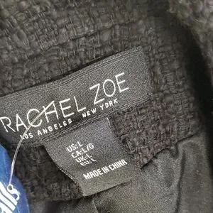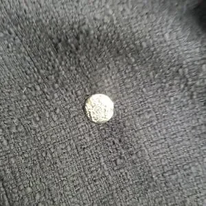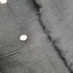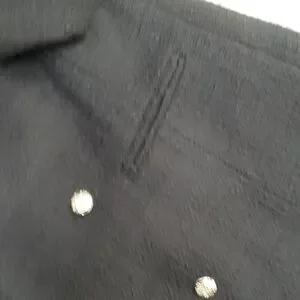 Elegant black coat with frayed edges. Features double-breasted style and decorative buttons. Perfect for formal events. -Black Chest-
