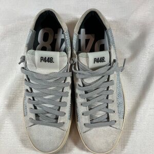 The P448 Jack sneakers feature a muted gray blue mint and white textured upper and luxurious light grey suede accents, a breathable terry cloth lining and memory foam insole that provides all-day comfort. They have a lightweight rubber sole with a distinctive light blue tread.