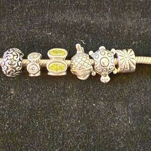 Pandora Silver Bracelet with 11 charms, 2 are clip charms