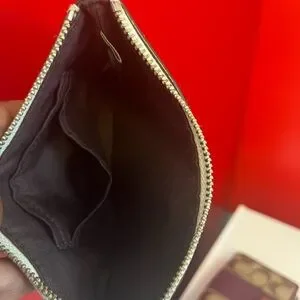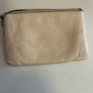 Stylish Coach wristlet in cream. Features playful patches including a bee, dice, and lightning bolt. Ideal for carrying essentials. This wristlet is preowned and has signs of use.