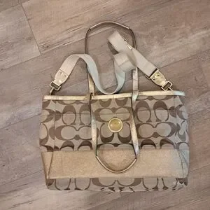 Elevate your style with the Coach Signature Tote Bag. Used in great condition. Few juice stains inside(used as baby tote) Not very noticeable.