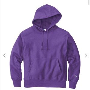 Classic Champion hoodie in dark purple. Features iconic logo. Comfortable and stylish.