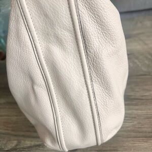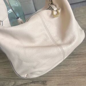 This Coach hobo bag in ivory pebbled leather is a versatile accessory for travel, workwear, or casual occasions. The bag has a zip closure, top handle with an 8" drop, and a medium size measuring 12" in width, 9" in height, and 2 1/2" in depth. The bag features buckle accents, stitching details, and a pebbled finish that gives it a unique character.