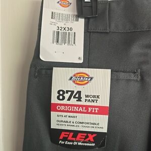 Dickies 874 pants in charcoal. Original fit with flex for comfort. Tough on stains and resists wrinkles.