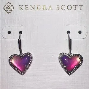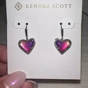 Brand new never been worn! These gorgeous Kendra Scott heart-shaped drop earrings feature a stunning purple iridescent stone set in silver-tone metal. Perfect for gifting or adding a touch of sparkle to your own collection. Comes with the original Kendra Scott dust bag.