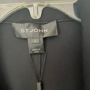 Sleek black jacket by St. John. Features a classic design with original adjustable belt