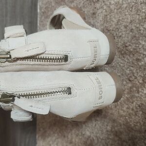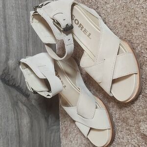 Natural oatmeal color wedge sandal with no signs of wear. Leather, buckles at ankle and zips in back. Wedge is approx 2.5 inches. Excellent condition.