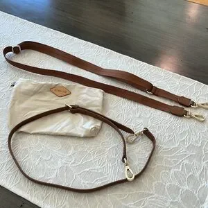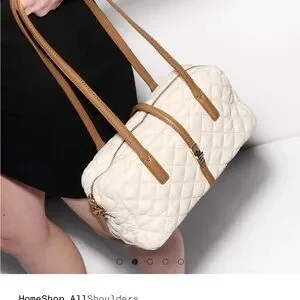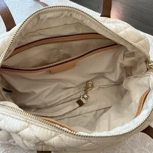 Quilted Ivory fabric bag with caramel leather straps. Measures approximately 11”Long is 3.5” in Width and measures 5.5” High. Handheld drop is 10.5”. Very light bag gold hardware. Has one exterior slip pocket with five interior pockets. Has key clasp inside. Includes two cross body straps w zippered pouch. Tags removed just purchased and never used. Great for travel.