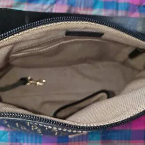 Pre-owned good condition, minor interior discoloration near zipper and bottom, minor scratches on leather, partial peeling on strap (see last photo)