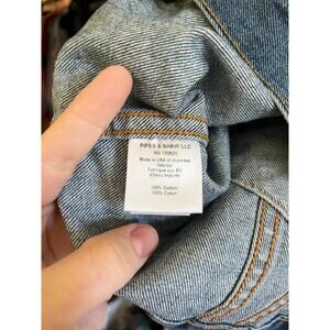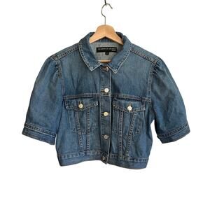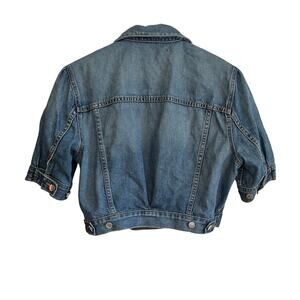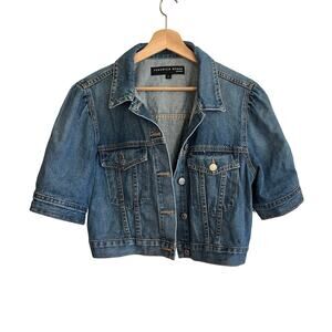 Beautiful and fun Y2K inspired cropped short sleeve denim jacket by Veronica Beard. Features two front pockets, short sleeves with a little princess puff, and cute collar. Can be worn as a top or layered as a jacket. Sleeves have two button settings for adjusting the size and style. Size XL. Excellent pre-owned condition.